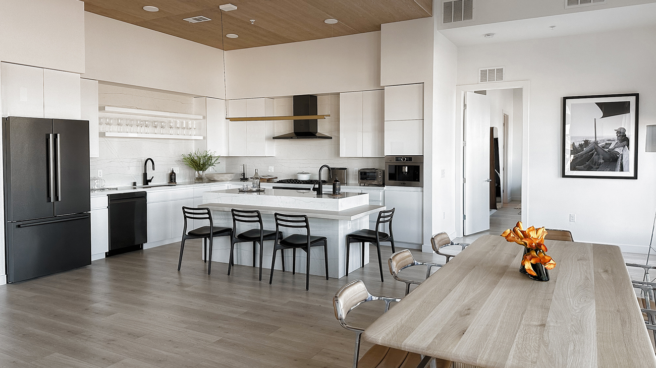 Residences range in size from one, two and three-bedroom serviced apartments to luxurious, multi-bedroom penthouses. Their overall sleek, modern and polished aesthetic highlights contemporary color palettes, designer-curated finishes, luxury wood-look plank flooring, pendant lighting, and custom closet systems.