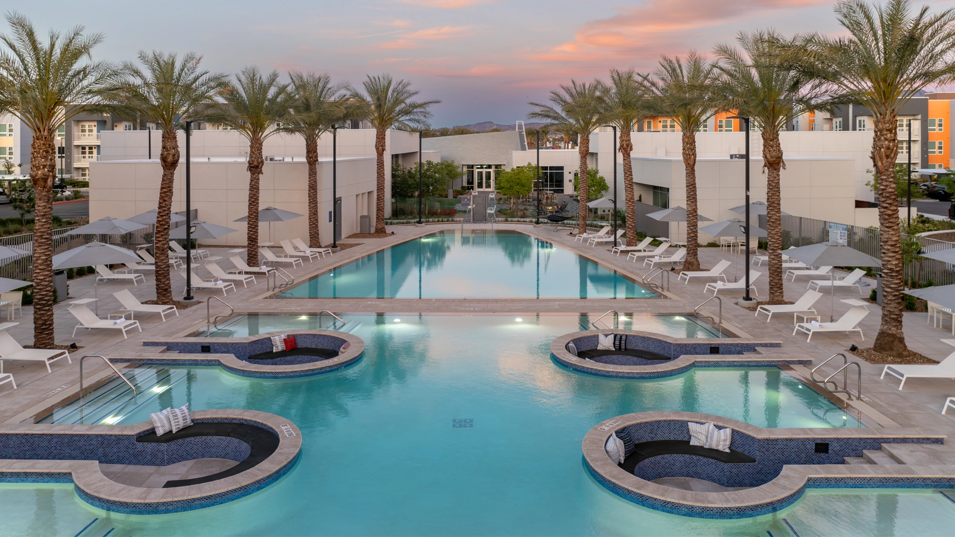Yet, the beauty of an Ariva stay is in the property’s multitude of inherent, indulgent amenities that just might encourage “nesting.” Lush greenery and manicured grounds frame the modern residential buildings. Nine indoor and outdoor lounges invite resident camaraderie. Three expansive, resort-style pools (two of which are heated), two spas, and a heated lap pool are every bit as sumptuous as those featured at Vegas’ poshest resorts. An expansive Great Lawn features furnished cabanas, barbeque grills, picnic tables, and an event stage allowing for live musical performances. Inviting fire pits complemented by bistro-style lighting are ideal for outdoor socializing on balmy nights. Curated social event programming is also offered, as well as a pet park for four-legged, in-residence family members.